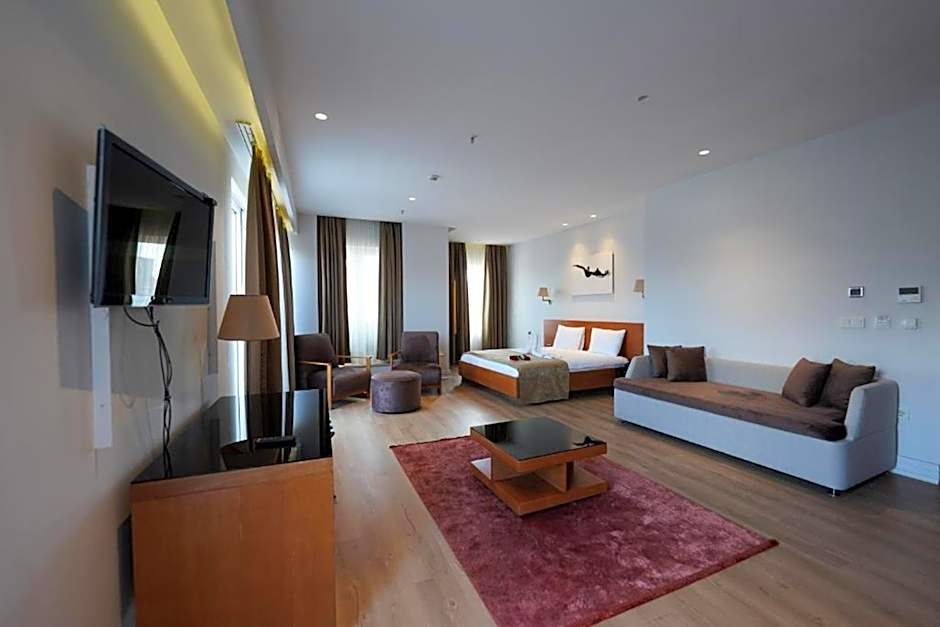This spacious suite has a modern decoration. It offers a large seating area with LCD TV and a sofa.